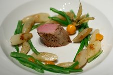 Tálaláskor egy kis serpenyőben olvasszunk fel 0,5ek vajat 1ek marha glace-szal és forgassuk meg benne a borjúfiléket. Éles késsel vágjunk 3-4cm magas darabokat a borjúhúsból, tegyük az előmelegített tányér közepére és körítsük a széles babos physalisos feketegyökérrel.